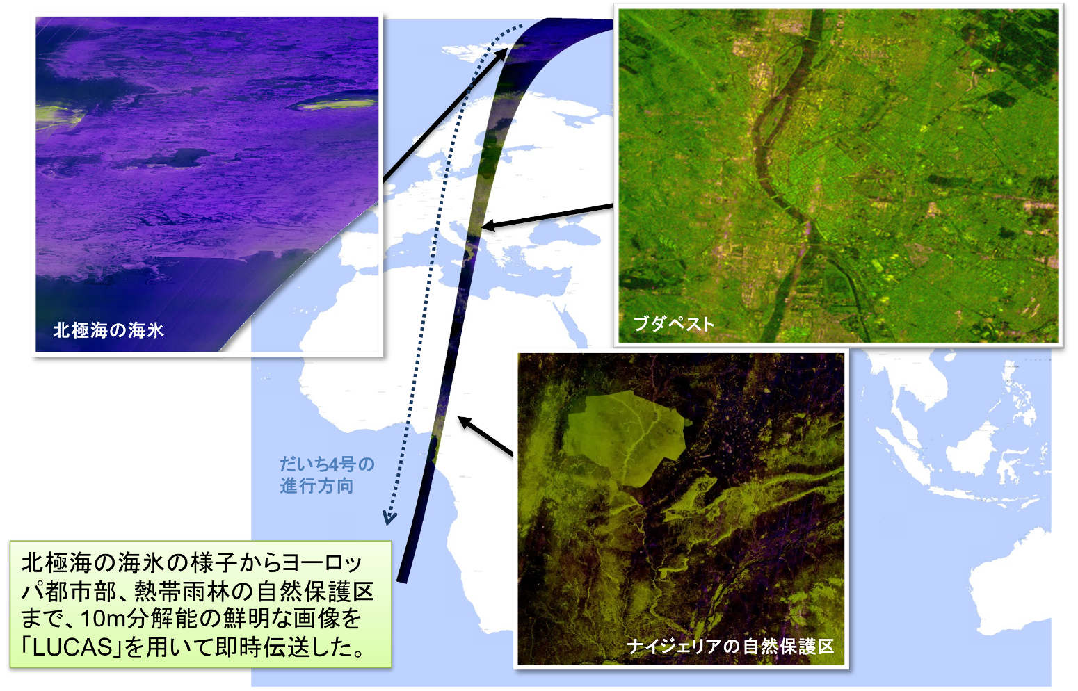 初期校正検証運用において取得。帯状の範囲の観測データを一度にダウンリンクし、地上局直接伝送では複数のパスに分割する必要があるような大量のデータを、即時的に取得することに成功した(北極海の海氷等、観測範囲の1部を拡大して表示。疑似カラー画像処理)。